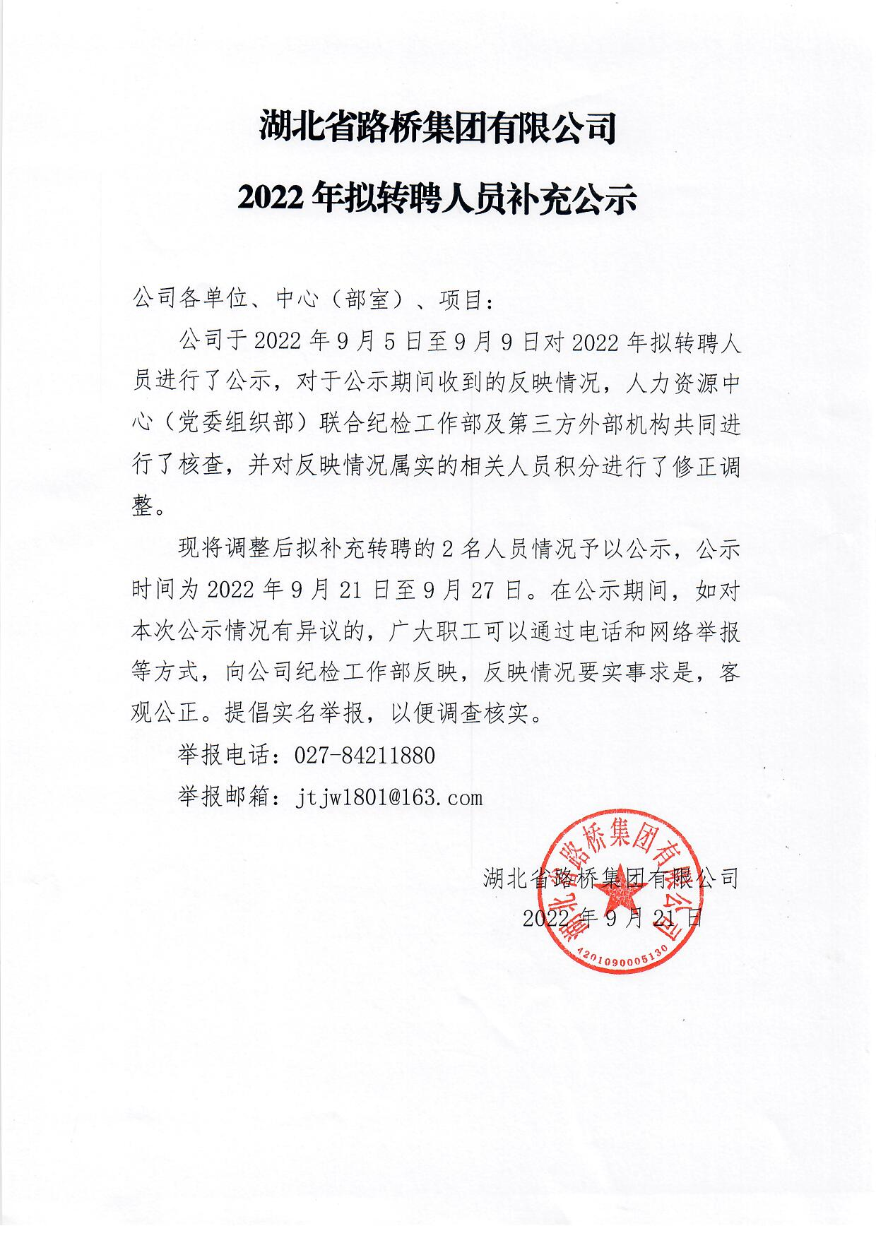 湖北省路橋集團有限公司2022年擬轉聘人員補充公示
