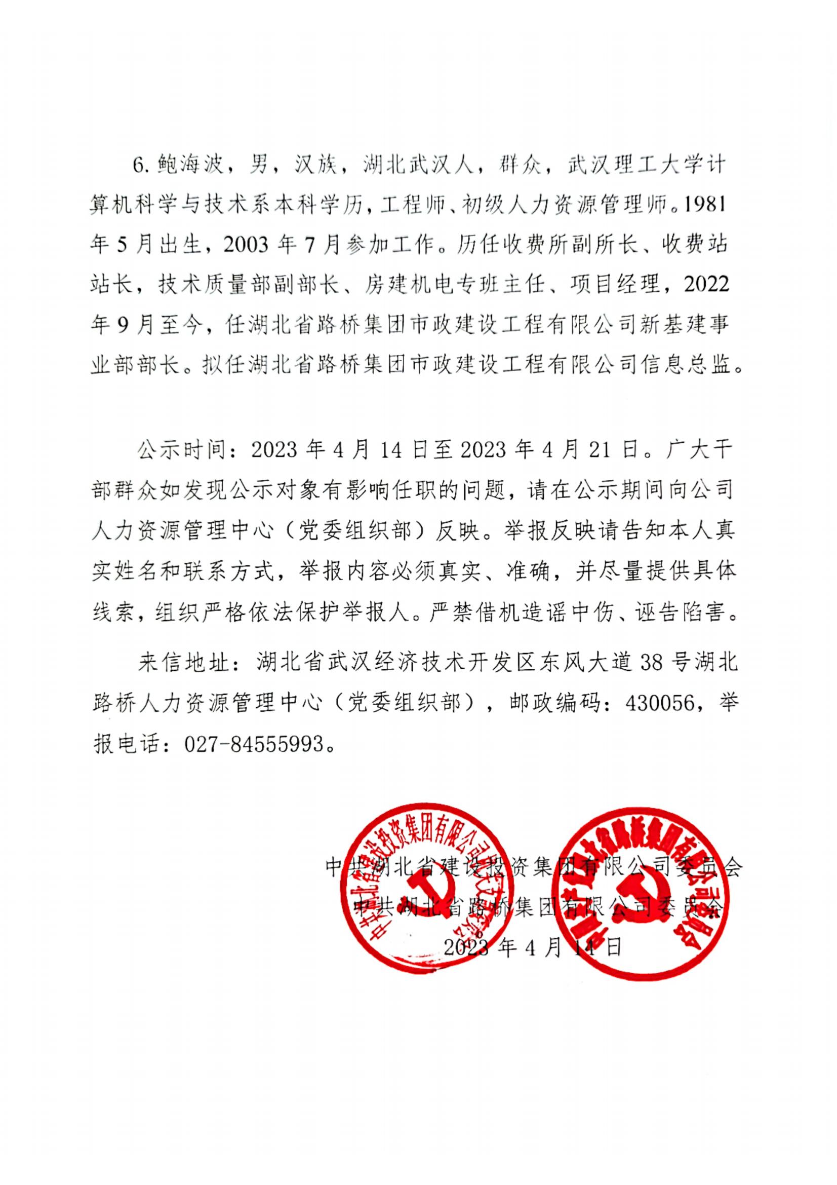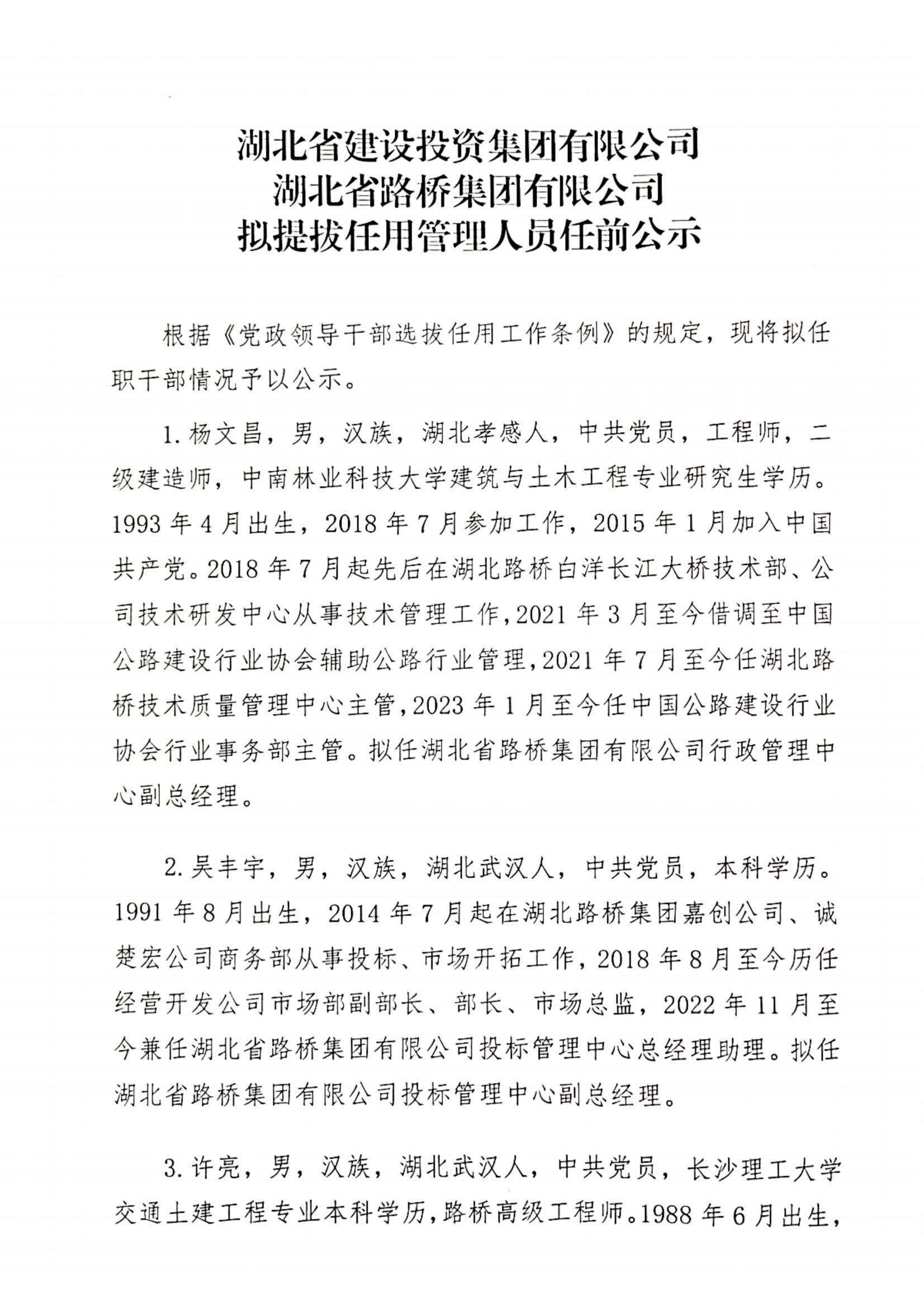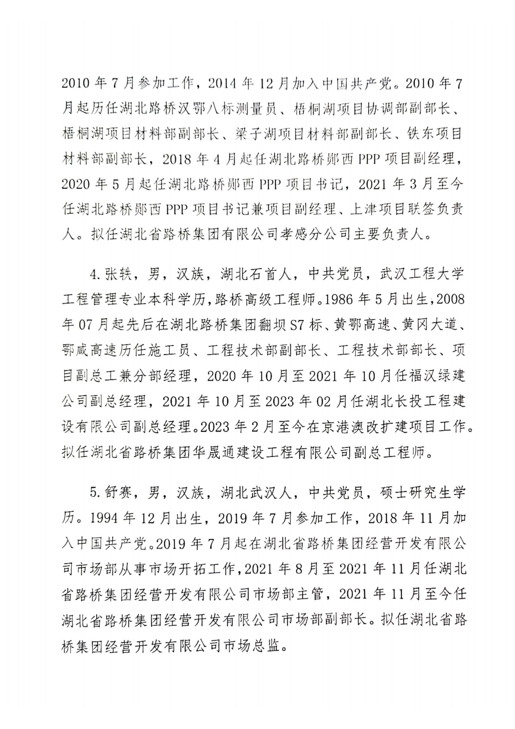 湖北省路橋集團有限公司擬提拔任用管理人員任前公示