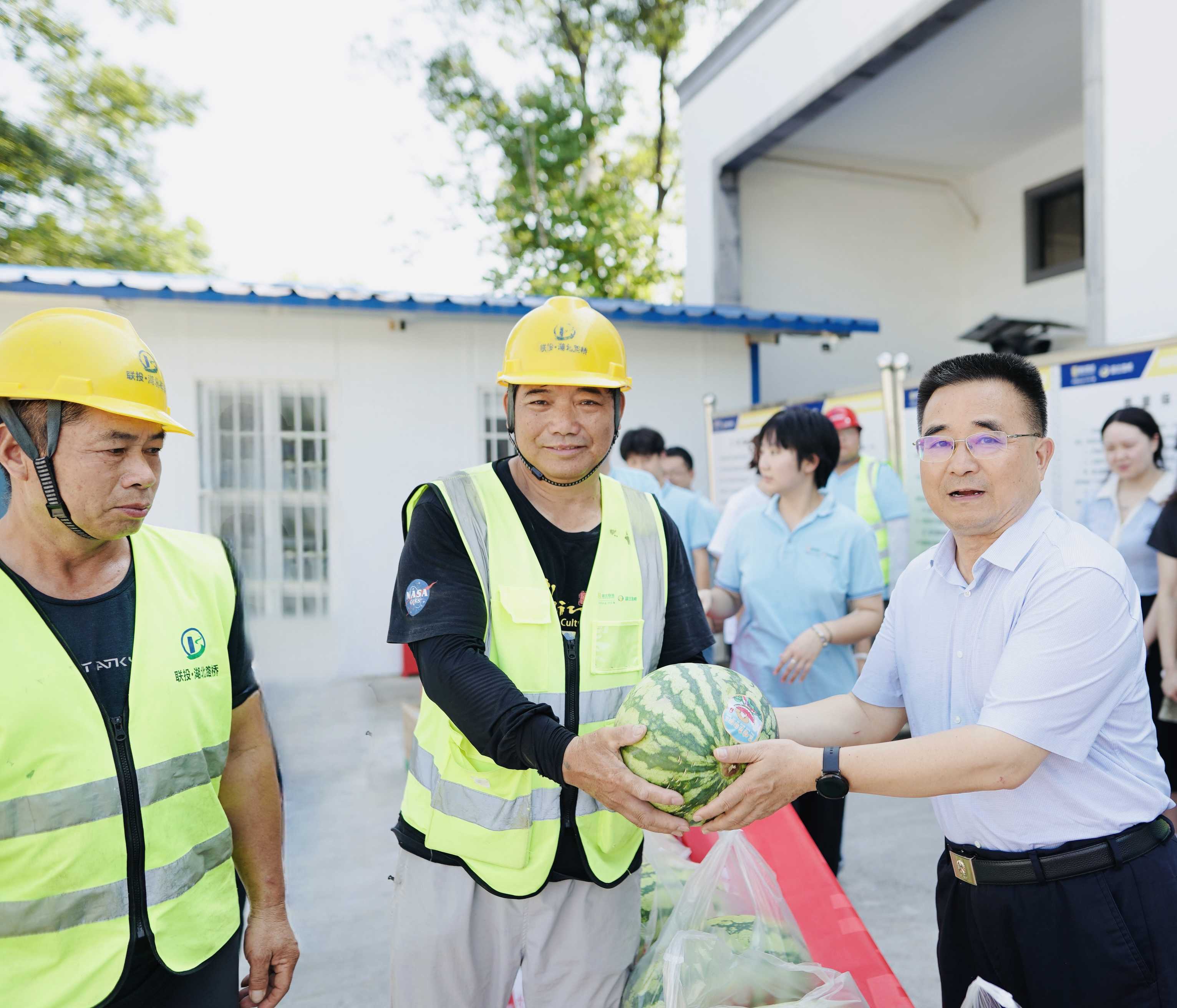 8月8日,湖北聯(lián)投黨委委員、副總經(jīng)理汪繼明赴湖北路橋孝感高新區(qū)交通基礎(chǔ)設(shè)施項(xiàng)目調(diào)研,并開(kāi)展“送清涼?送健康 送關(guān)愛(ài)”系列活動(dòng)。湖北路橋黨委委員、副總經(jīng)理、工會(huì)主席王華瑞,副總經(jīng)理曾祥能陪同調(diào)研。
